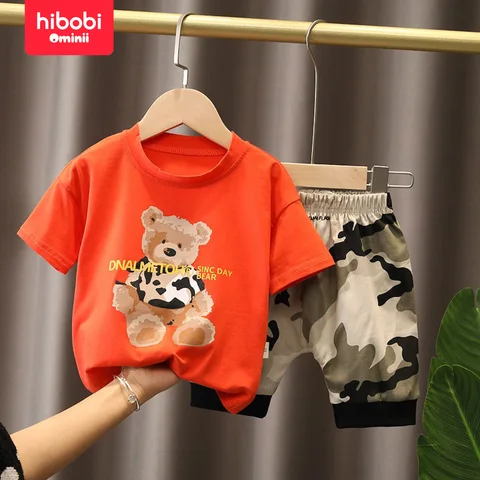 hibobi Two-Piece Set Boys Clothes Summer Fashionable Baby Clothes Children Summer Cartoon Bear Print Round Neck Short-Sleeved