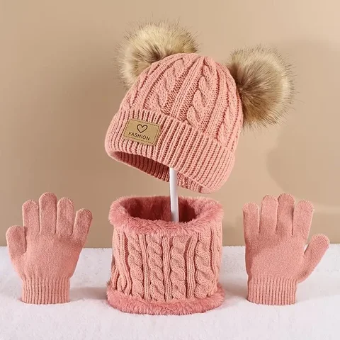 Children Winter Warm Suits Knitted Hat Scarf and Gloves Set For Girls Boy Pompoms Baby Beanies Cap Christmas Gifts For Kids 1-5y